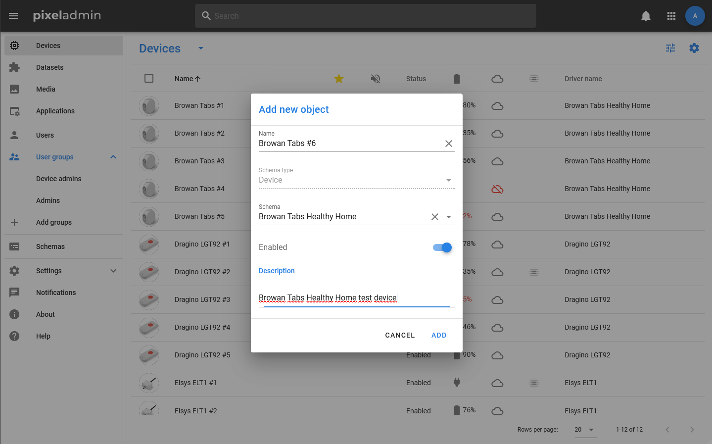 3. In the window that opens, enter the name of the device, select the data schema on which it should be created, and optionally specify a description.