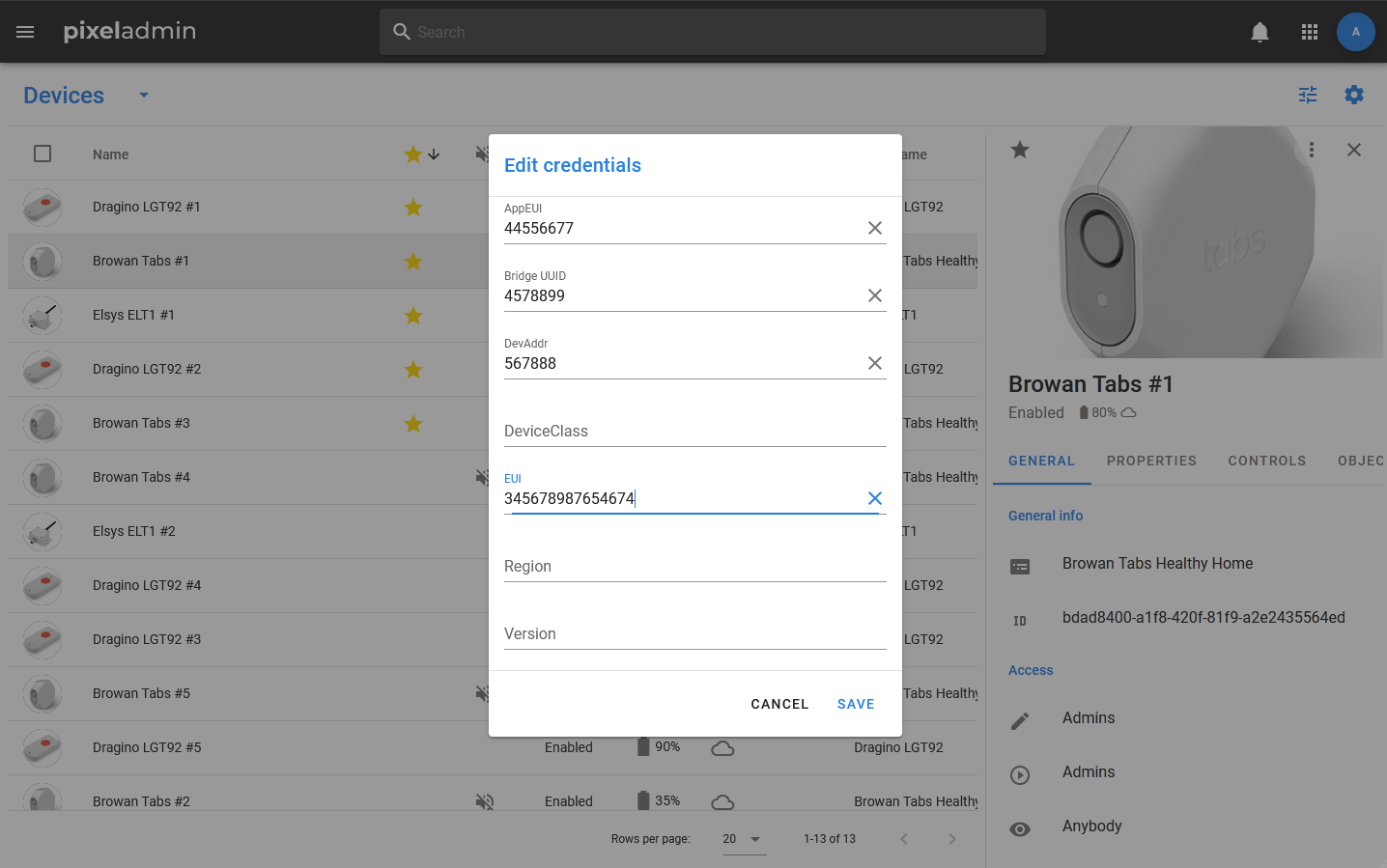 • GENERAL — a tab with basic information about the device. It displays the name of the data schema on the basis of which the device was created, information about access rights, a description of the device and its UUID.
