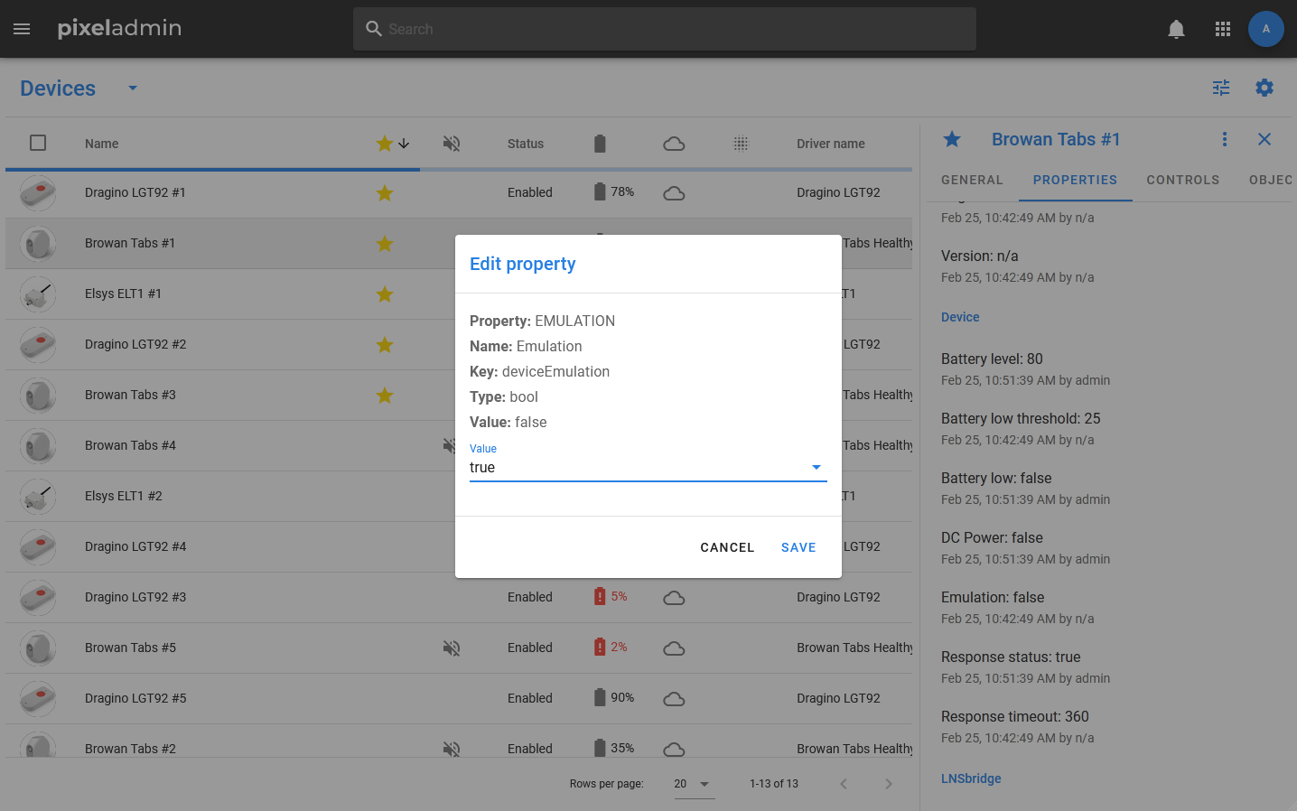 Detailed information about the device is displayed in the card. The status, information about the battery, emulation, and the presence of installed but not applied pending values is included in the subtitle: the status is displayed in text, and icons are used for the rest of the data.