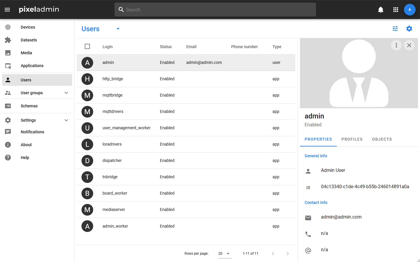 The profile can be disabled or deleted. Disabling allows you to deny the user access to the application, while preserving its settings: this may be necessary in case of temporary blocking. If necessary, the profile can be edited by the administrator through the Admin Pixel: since the profile is a dataset, all the same actions are available for it as for any other dataset.