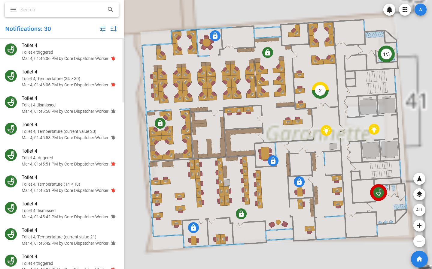 You can view the latest notifications by clicking on the bell in the upper right corner. In the list that opens, you can view all notifications or select a tab with notifications of a specific type, for example, only alarms.