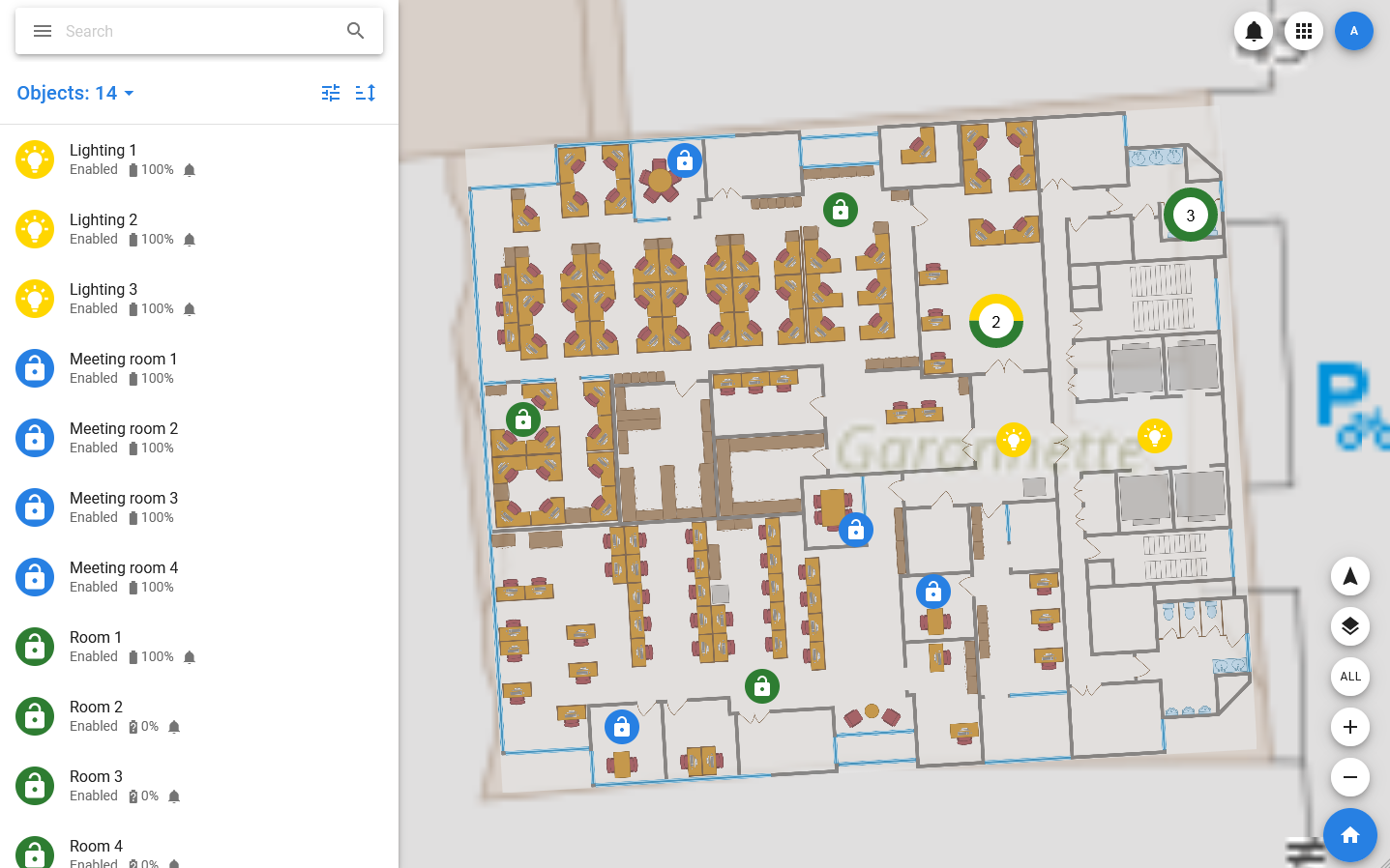 When you hover the mouse pointer over an object on the map, a card opens, which displays a picture of the object, its name and a set of statuses. When you click on an object, it switches to selection mode and opens its main card, which overlaps the list on the left side of the screen.